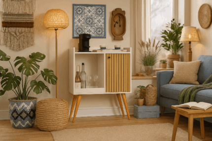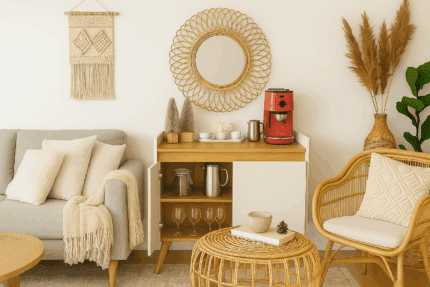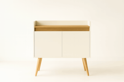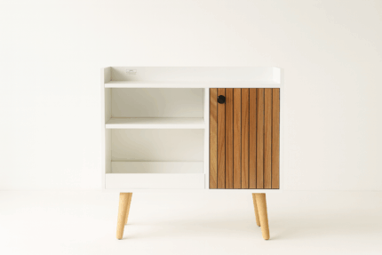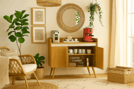 A compact and elegant coffee station with two easy-access shelves and a sleek cabinet for hidden storage. Designed to keep your coffee essentials neat, organized, and always within reach.home.