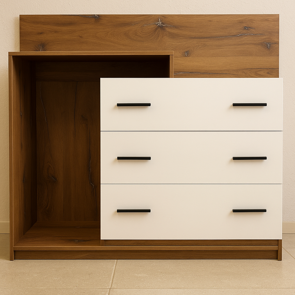 - Right side: 2 shelves, 1 hanger and 2 drawers
