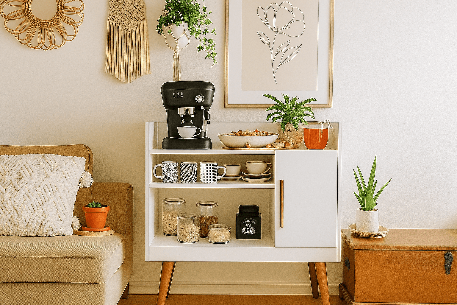 A compact and elegant coffee station with two easy-access shelves and a sleek cabinet for hidden storage. Designed to keep your coffee essentials neat, organized, and always within reach.home.