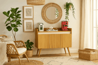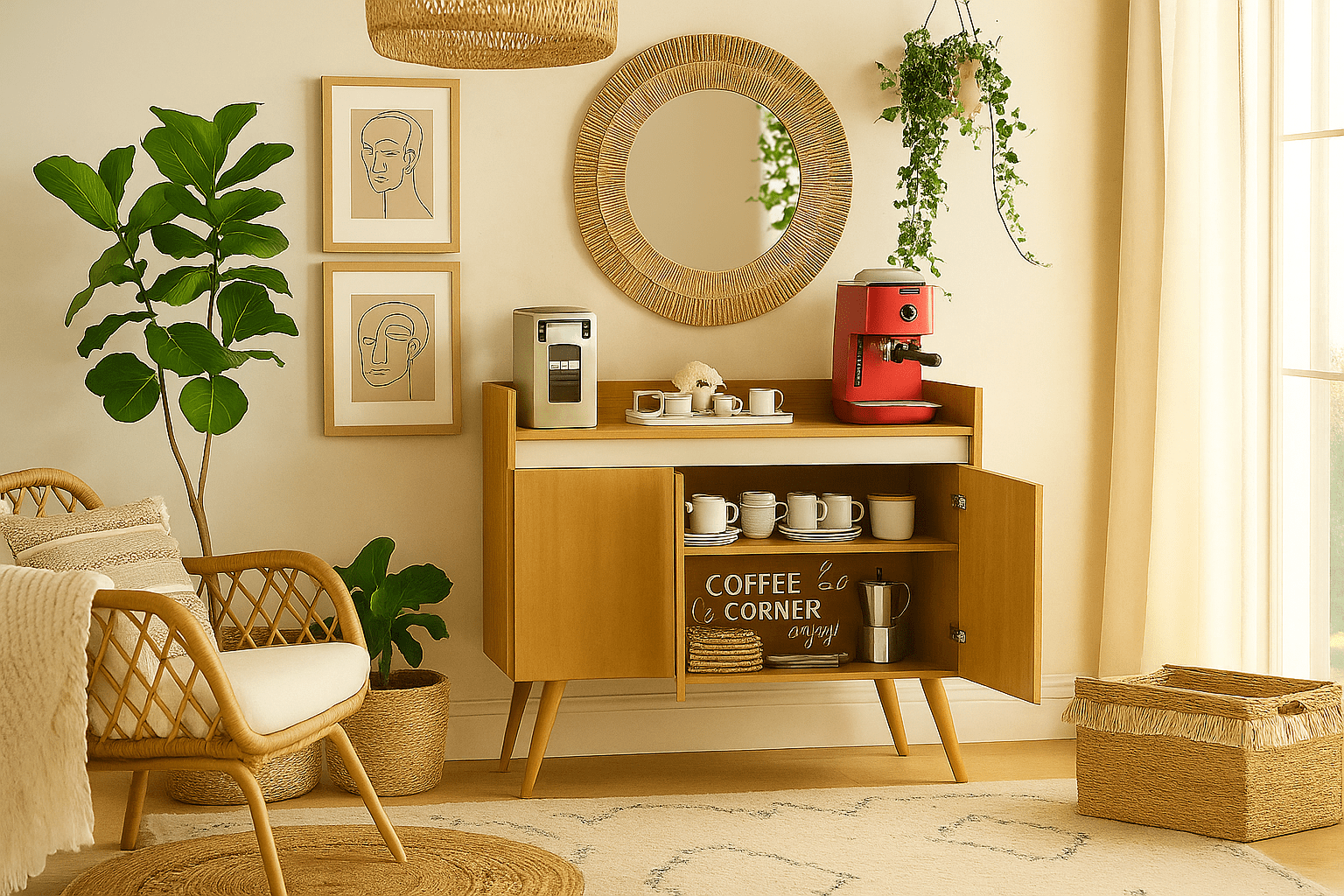 Coffee Corner — A beautifully designed coffee station that keeps everything in one place. Featuring three spacious leaves for cups, pods, jars, and accessories, this unit blends style, function, and durability. The perfect centerpiece for your daily coffee routine anywhere in your home.