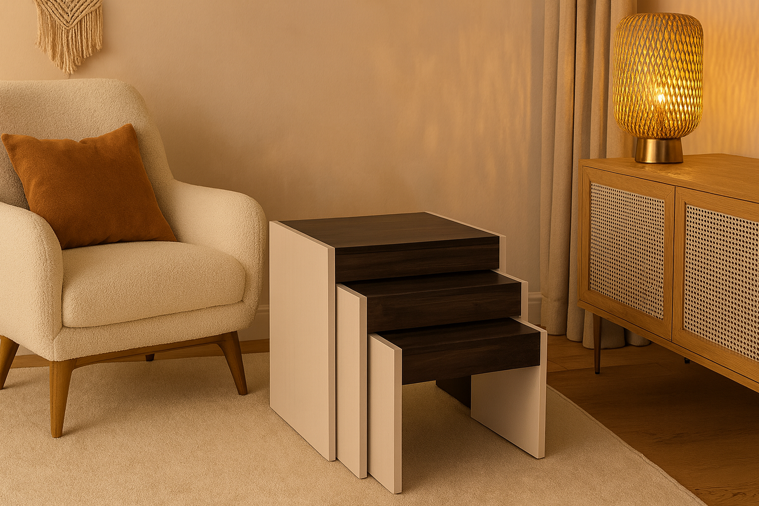 Add a touch of elegance to your living room with our overlapping side table. Sleek and practical, it’s the perfect space-saving solution. Available in a range of finishes to complement any decor.