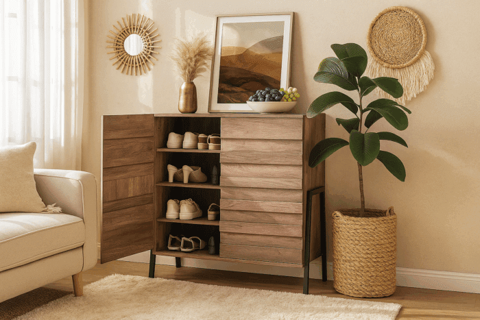 A compact shoe rack with 2 leaves and a modern metal stand. It offers smart storage in a small footprint, helping you organize your shoes neatly while adding a stylish touch to any corner of your home.