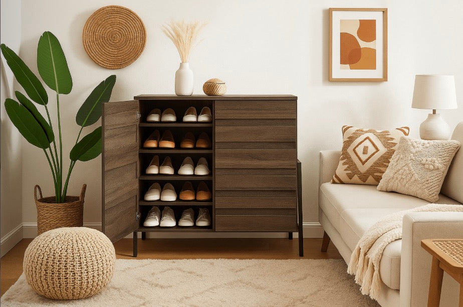 This shoe rack features 2 spacious leaves paired with a sleek metal stand, offering smart storage in a compact, stylish design. Ideal for entryways, bedrooms, and living spaces, it keeps your footwear organized without taking up much room. Dimensions: